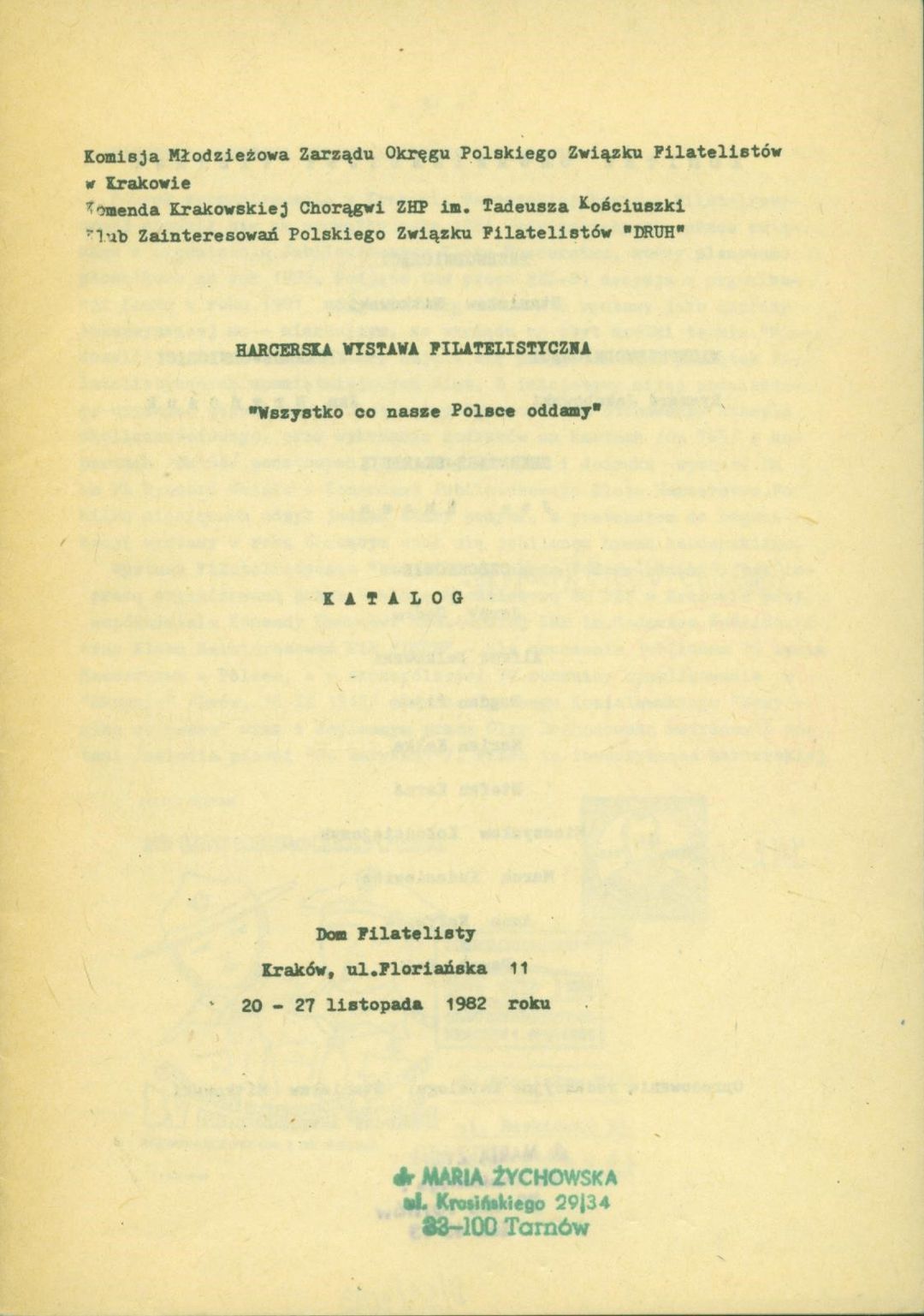 | Instytucje sprawcze: | Zarząd Okręgu Polskiego Związku Filatelistów - Komisja Młodzieżowa Związek Harcerstwa Polskiego Polski Związek Filatelistów - Klub Zainteresowań Druh |