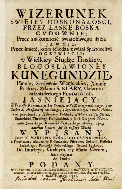 Wizerunek swiętey doskonałosci przez łaskę Boską cvdownie, przez znákomitość świątobliwego żyćia jawnie, przez śmierć, ktorą schodzą z świátá Sprawiedliwi oczywiscie w Wielkiey Słudze Boskiey, błogosławioney Kunegundzie, Pannie, Królewnie Węgierskiey, Xięźnie Polskiey Zakonu s. Klary, Klasztoru Starosądeckiego fundatorce, jaśniejący. Z Processu Kánonizácyi Tey Świętey, w Polßcze wywiedźionego y do Stolice S. Apostolskiey odesłánego, y ápprobowánego, z wielu Authorów poważnych, y Historyków Polskich osobliwie z Pism stárych Stánisłáwá Theologá Fráńciszkáná, y Janá Długoszá Nominatá Lwowskiego, Kánoniká Krákowskiego zebrány, z przydatkiem Cudów aß do náßego Wieku