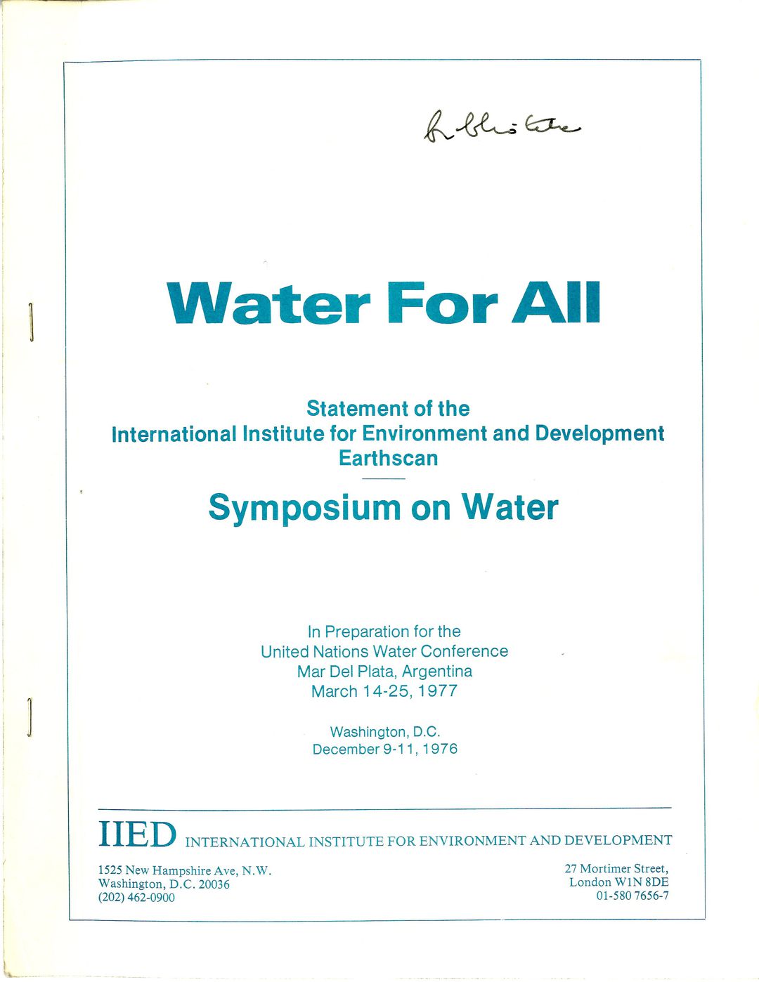 | Inne tytuły: | Symposium on water in preparation for the United Nations Water Conference, Mar del Plata, Argentina, March 14-25, 1977 statement of the International Institute for Environment and Development, Earthscan |