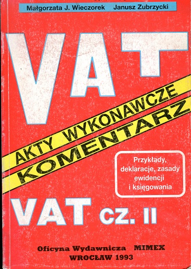 | Inne tytuły: | Komentarz. Teksty aktów prawnych. Wzory deklaracji i przykłady ich wypełniania, zasady ewidwncjonowania i dokumentowania obrotów, VAT-u i akcyzy, aktualne zasady księgowania VAT-u i akcyzy z wieloma przykładami VAT Część II |