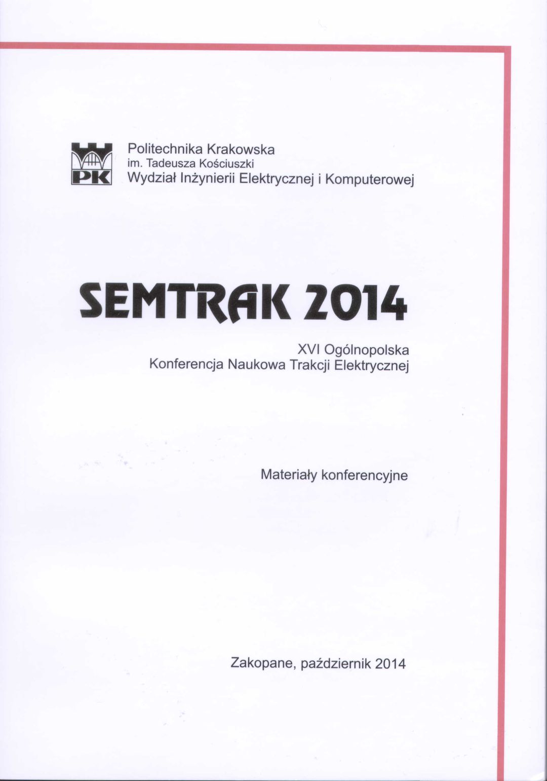 | Inne tytuły: | XVI Ogólnopolska Konferencja Naukowa Trakcji Elektrycznej materiały konferencyjne, Zakopane, październik 2014 |