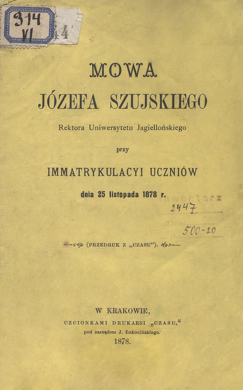 Mowa Józefa Szujskiego rektora Uniwersytetu Jagiellońskiego przy immatrykulacyi uczniów dnia 25 listopada 1878 r