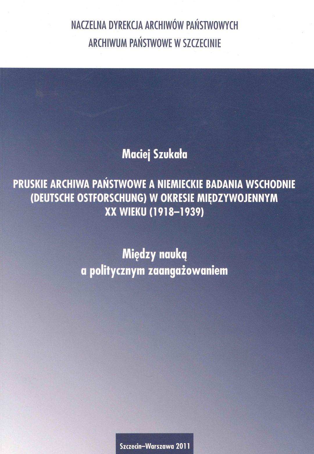 Publikacja autorstwa dr hab. Macieja Szukały przedstawia m.in. rozwój instytucji archiwów pruskich - od reform Hardenberga, poprzez działania reformatorskie Bismarcka, do pierwszej wojny światowej. Ukazuje ewolucje archiwów od urzędów o drugorzędnym znaczeniu do placówek naukowych. Autor omawia również wpływ rezultatów pierwszej wojny światowej na powstanie nowego typu badań oraz formy centralnej koordynacji badań wschodnich w okresie III Rzeszy, przedstawia ewolucję badań regionalnych. - [www.szczecin.ap.gov.pl/]