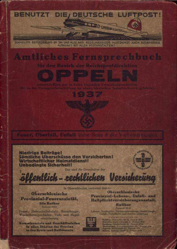 | Inne tytuły: | Amtliches Fernsprechbuch für den Bezirk der Reichspostdirektion Oppeln 1937 |