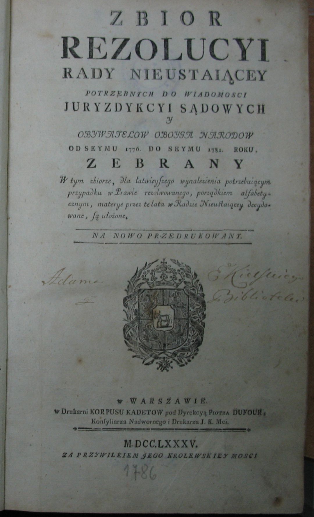 Zbior rezolucyi Rady Nieustaiącey potrzebnych do wiadomosci juryzdykcyi sądowych y obywatelow oboyga narodow od seymu 1776 do seymu 1782 zebrany