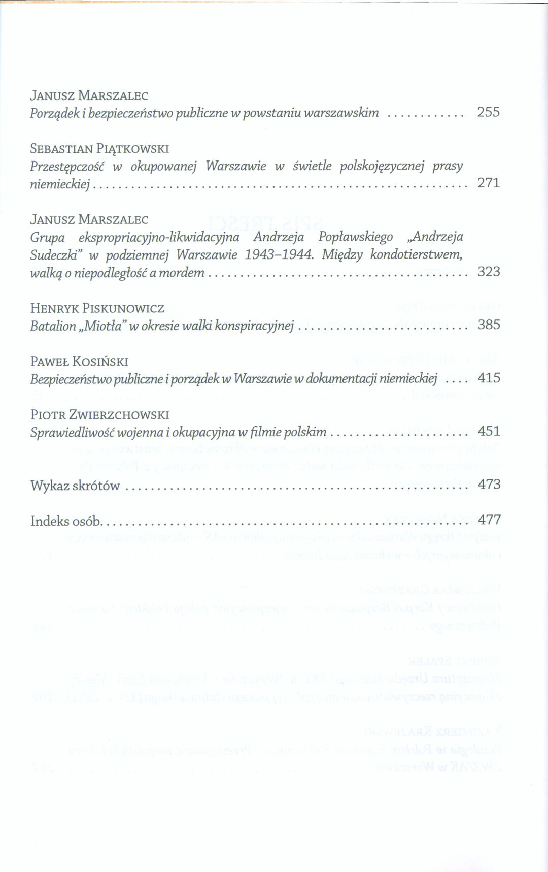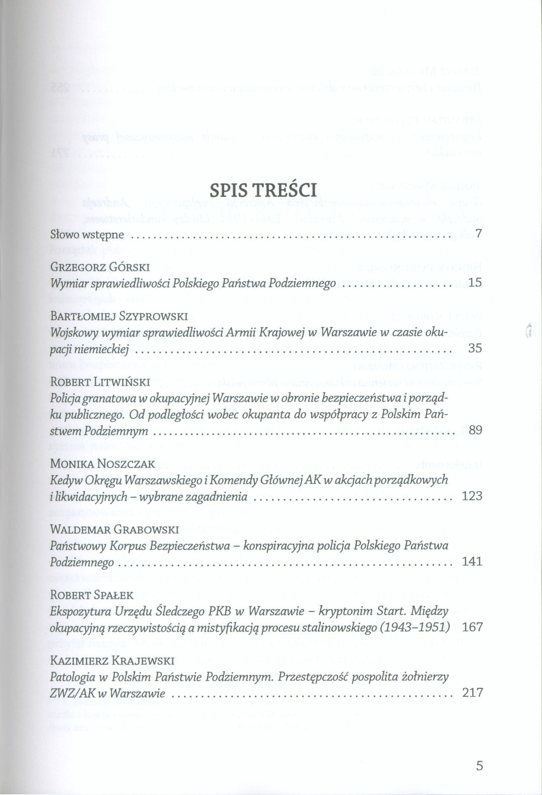Porządek publiczny i bezpieczeństwo to wartości, których ochrony w latach okupacji niemieckiej podjęły się instytucje i organizacje Polskiego Państwa Podziemnego. Dla hitlerowskiego najeźdźcy chaos, znieprawienie, anarchizacja postaw części warszawiaków były czynnikami sprzyjającymi dodatkowemu zastraszeniu ogółu mieszkańców miasta i okolic. Potrzeba bojkotowania niemieckich przepisów prawnych, biernego i czynnego przeciwstawienia się władzy okupanta, choć były konieczne, to stwarzały niebezpieczeństwo wykształcenia nawyków, które przeniesione w przyszłość, do wolnej Polski, stanowić mogły niebezpieczeństwo dla jej rozwoju i bytu. Elity państwa konspiracyjnego walczyły więc o przywracanie mieszkańcom Warszawy minimum bezpieczeństwa egzystencjalnego niezbędnego do przetrwania fizycznego i podtrzymania wzorców moralnych. Nawet jeśli walka ta była ograniczona, często nieskuteczna, a po części iluzoryczna, to pozostawała zauważanym świadectwem moralności i żywotności narodu i państwa podziemnego, zwalczającego zarówno przestępczość pospolitą i bandytyzm, jak i szmalcownictwo, aż po szpiegostwo, kolaborację i zdradę. Publikowane artykuły stanowią przyczynki, syntezy aż po studia problemów. Niektóre są przede wszystkim podsumowaniem dotychczasowych badań, inne łączą wiedzę szerzej dostępną z nowatorskimi ustaleniami i nieznanymi szczegółami, wreszcie zamieszczamy w tomie i teksty o cechach pionierskich, wytyczające i wskazujące nowe kierunki badań. Lektura całości powinna stanowić przydatne uzupełnienie wiedzy dla zawodowych historyków-badaczy, zarazem być może stanie się istotną pozycją dla wielbicieli Klio, w tym nauczycieli, studentów i dziennikarzy.