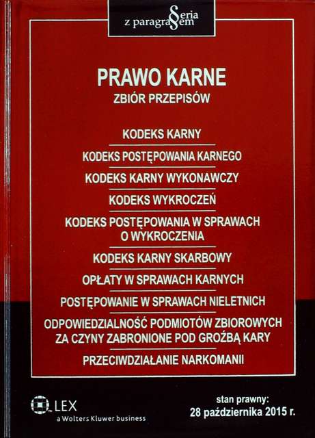 Prawo karne Zbiór przepisów Kodeks Karny Kodeks Postępowania karnego Kodeks Karny Wykonawczy Kodeks Wykroczeń Kodeks Postępowania w sprawach o wykroczenia Kodeks karny Skarbowy Opłaty w sprawach karnych Postępowanie w sprawach nieletnich Odpowiedzialność podmiotów zbiorowych za czyny zabronione pod groźbą kary Przeciwdziałanie narkomanii Stan prawny na 28 października 2015 r.