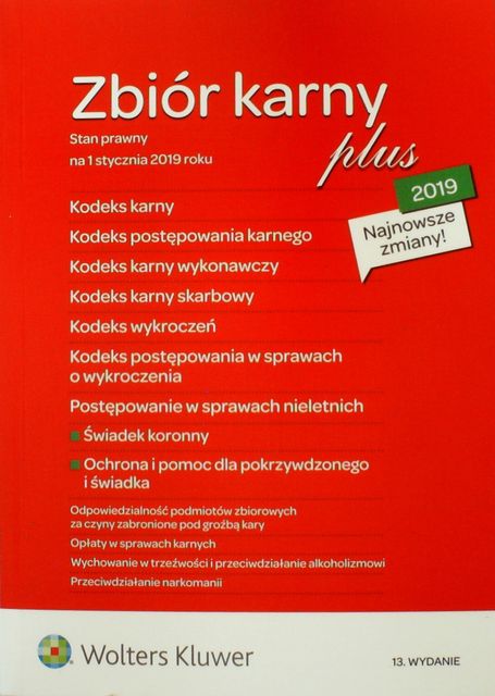 | Inne tytuły: | Kodeks karny skarbowy Kodeks karny wykonawczy Kodeks postępowania karnego Kodeks postępowania w sprawach o wykroczenia Kodeks wykroczeń Ochrona i pomoc dla pokrzywdzonego i świadka Postępowanie w sprawach nieletnich Świadek koronny |