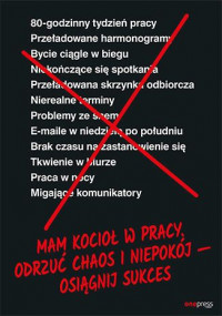 Długie godziny pracy, życie w ciągłym biegu, wieczny niepokój i niedobór snu stały się punktem honoru dzisiejszych pracowników. "Muszę dać z siebie wszystko", "trzeba bardziej się starać", "muszę dłużej pracować" - taka postawa nader często zamiast do sukcesu prowadzi do wypalenia zawodowego, chronicznego zmęczenia i problemów ze zdrowiem. Skądinąd inteligentni ludzie wierzą, że bez poświęcenia resztek życia prywatnego i ciągłego chaosu nie mają szans na osiągnięcie wyznaczonych celów i pomyślny rozwój kariery. Tymczasem kluczem do zwiększenia wydajności jest ograniczenie czynników, które rozpraszają uwagę i są źródłem stresu.