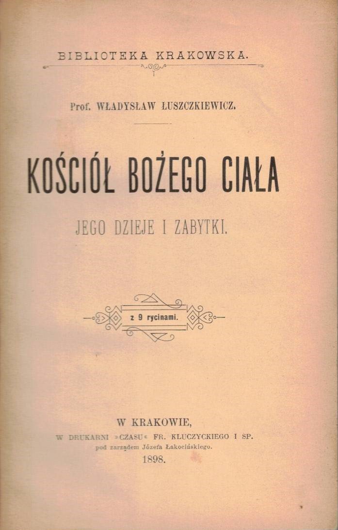 | Inne tytuły: | Historya Krakowa w zarysie Kościół Bożego Ciała jego dzieje i zbytki |