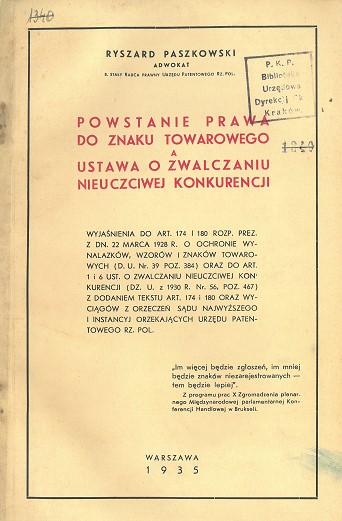 wyjaśnienia do art. 174 i 180 Rozp. Prez. z dn. 22 marca 1928 r. O ochronie wynalazków, wzorów i znaków towarowych (D.U. Nr. 39, poz. 384) oraz do art. 1 i 6 ust. o zwalczaniu nieuczciwej konkurencji (Dz.U. z 1930 r., Nr. 56, poz. 467) z dodaniem tekstu art. 174 i 180 oraz wyciągów z orzeczeń Sądu Najwyższego i instancyj orzekających Urzędu Patentowego Rz. Pol