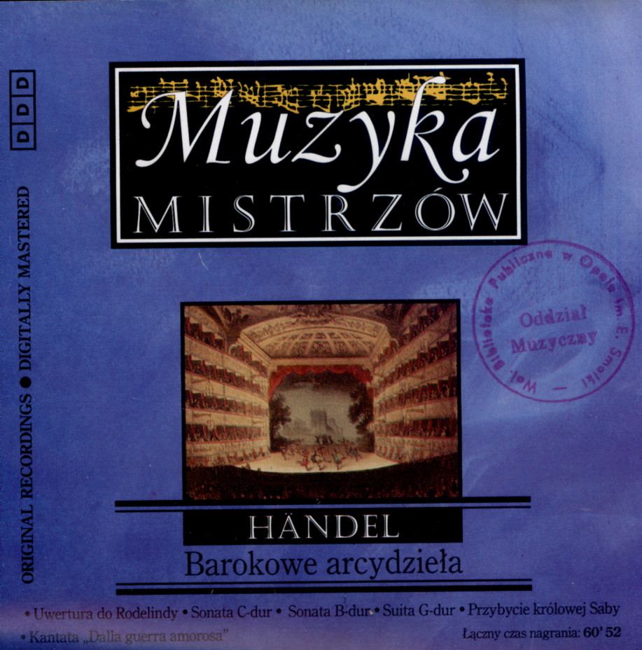 | Inne tytuły: | Kantata "Dalla Guerra Amorosa" Sonata B-dur na skrzypce i orkiestrę Sonata C-dur na wiolonczelę i fortepian Uwertura do Rodelindy Przybycie królowej Saby z Oratorium "Salomon" Suita G-dur na klawesyn |