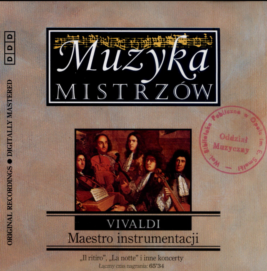 | Inne tytuły: | Koncerty Koncert C-dur na dwie trąbki RV 537 Koncert C-dur na mandolinę RV 425 Koncert D-dur na wiolonczelę Koncert Es-dur na skrzypce i instrumenty smyczkowe "Il Ritiro" RV 256 Koncert F-dur na dwa oboje, dwa rogi, skrzypce i instrumenty smyczkowe RV 571 Koncert g-moll na flet, op.10 nr 2 "La Notte" RV 439 Koncert skrzypcowy D-dur RV 124 Koncerty RV 425 Koncerty RV 571 Koncerty Op. 10 nr 2 Koncerty RV 256 Koncerty RV 404 Koncerty RV 537 Maestro instrumentacji Antonio Vivaldi Koncerty RV 124 |