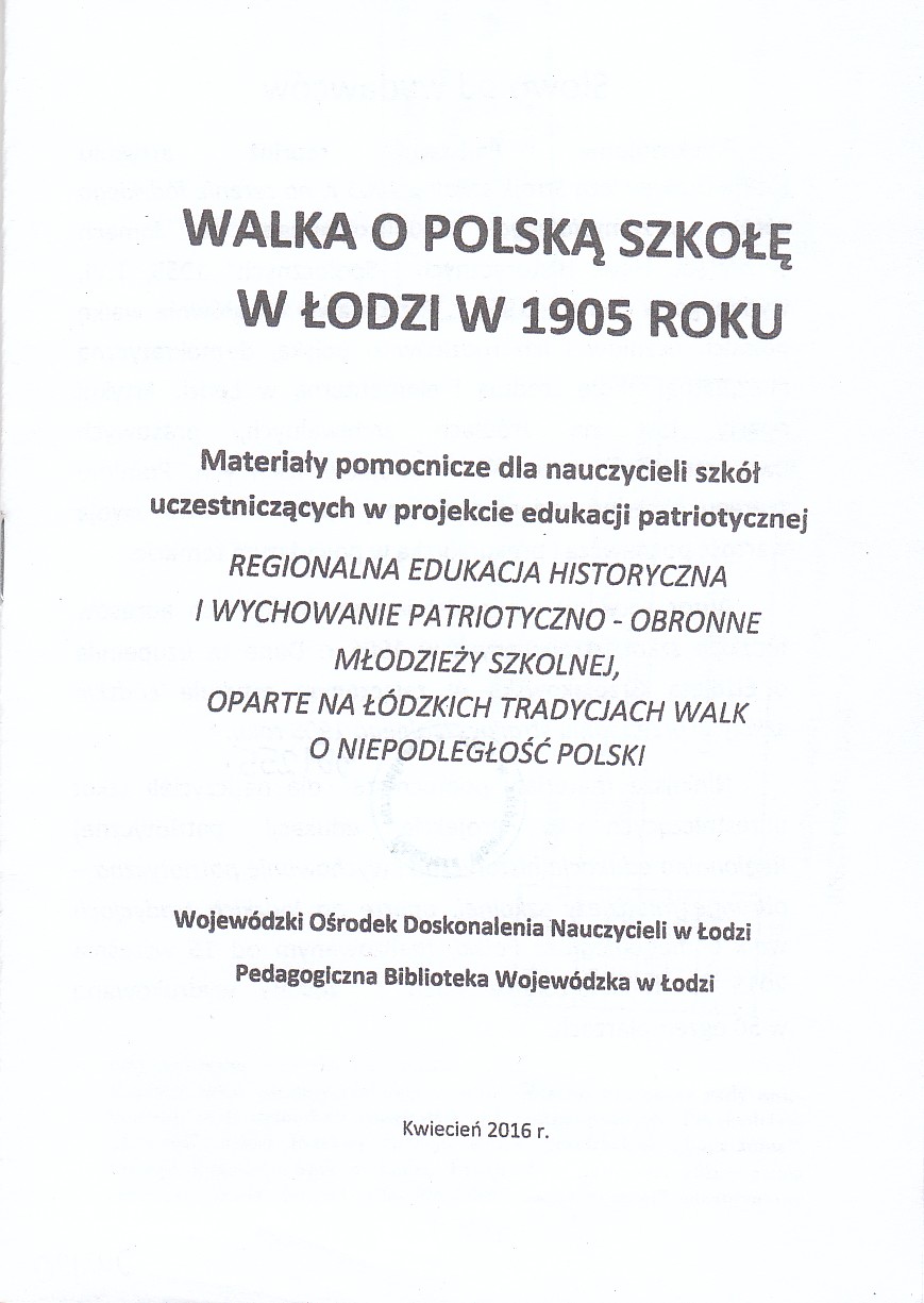 | Inne tytuły: | materiały pomocnicze dla nauczycieli szkół uczestniczących w projekcie edukacji patriotycznej regionalna edukacja historyczna i wychowanie patriotyczno-obronne młodzieży szkolnej, oparte na łódzkich tradycjach walk o niepodległość Polski |