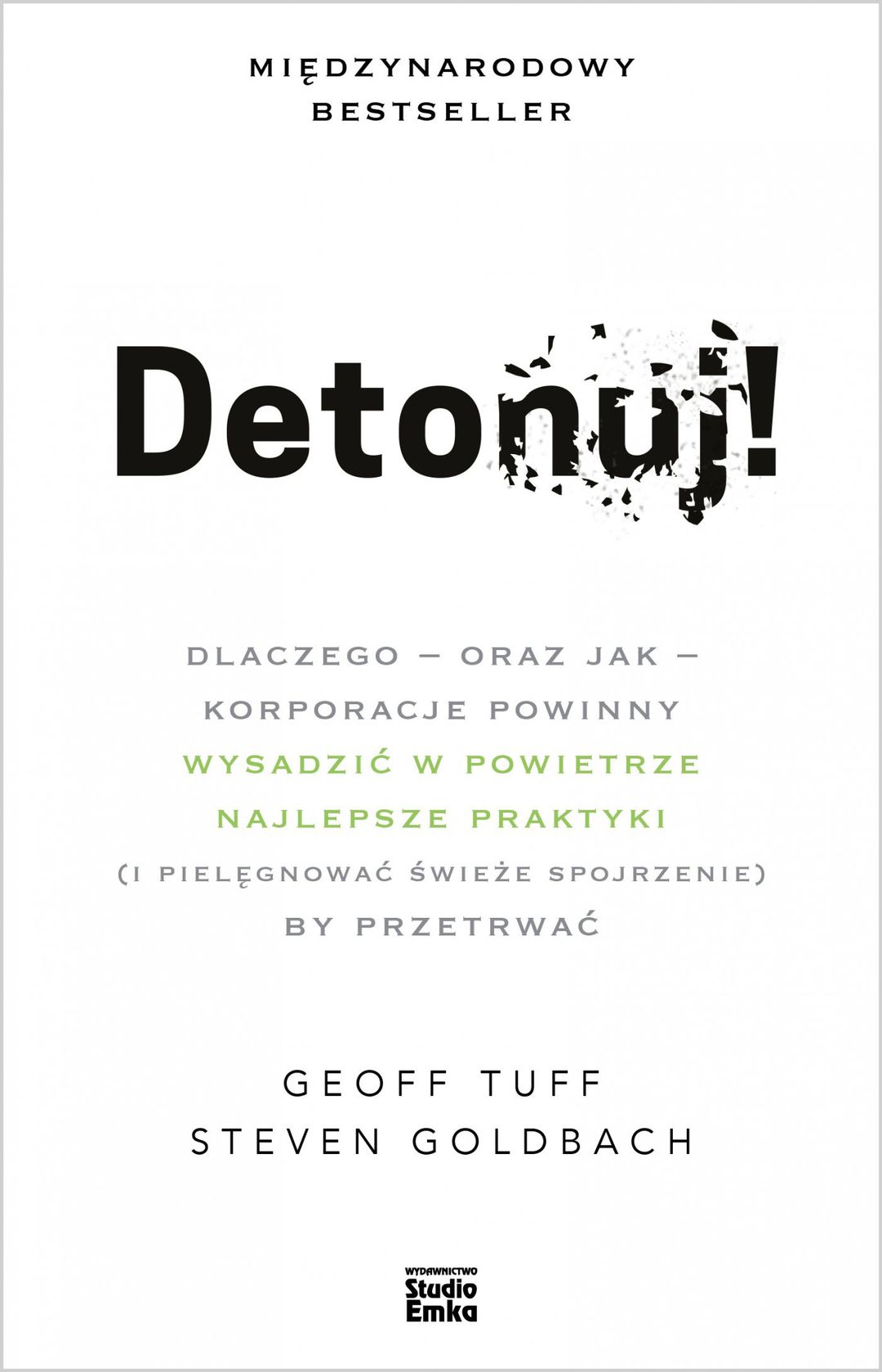 Detonuj! to książka, której autorzy odwołują się do zachowań sprzecznych z intuicją, zachęcając organizacje do kwestionowania wszystkiego, co przyczynia się do tworzenia złudnej stabilności. Tłumaczą, w jaki sposób kształtują się niewłaściwe firmowe nawyki. Uczą, jak wykrywać - i likwidować - „najlepsze praktyki”; przedstawiają rozwiązania alternatywne, które mogą zapewnić sukces. Analizując naturę zmiany, Tuff i Goldbach wyjaśniają, dlaczego „standardowe procedury prowadzenia działalności”, opracowane w przeszłości, nie będą obowiązywały w przyszłości, i wskazują siedem „utartych reguł postępowania”, które należy zastąpić nowymi praktykami. Radzą też firmom, jak tego dokonać, stosując cztery podstawowe zasady pozwalające skutecznie współzawodniczyć w czasach przyspieszającej zmiany.
