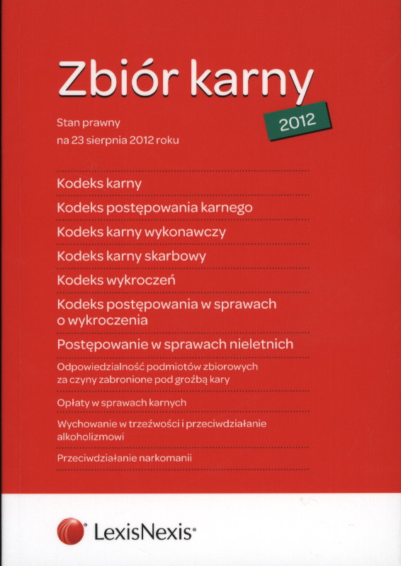 | Inne tytuły: | Kodeks karny Kodeks karny skarbowy Kodeks karny wykonawczy Kodeks postępowania karnego Kodeks postępowania w sprawach o wykroczenia Kodeks wykroczeń Odpowiedzialność podmiotów zbiorowych za czyny zabronione pod groźbą kary Opłaty w sprawach karnych Postępowanie w sprawach nieletnich Przeciwdziałanie narkomanii Wychowanie w trzeźwości i przeciwdziałanie alkoholizmowi |
