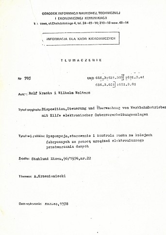 | Inne tytuły: | Dyspozycja, sterowanie i kontrola ruchu na kolejach fabrycznych za pomocą urządzeń elektronicznego przetwarzania danych |