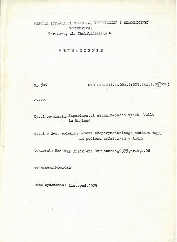 | Inne tytuły: | Budowa eksperymentalnego odcinka toru na podłżu asfaltowym w Angli |