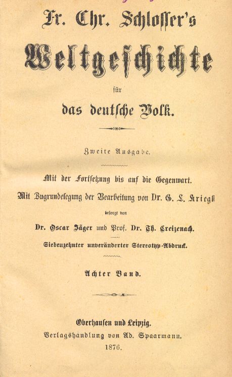 | Inne tytuły: | Fr. Chr. Schlossers Weltgeschichte für das deutsche Volk Friedrich Christoph Schlossers Weltgeschichte für das deutsche Volk |