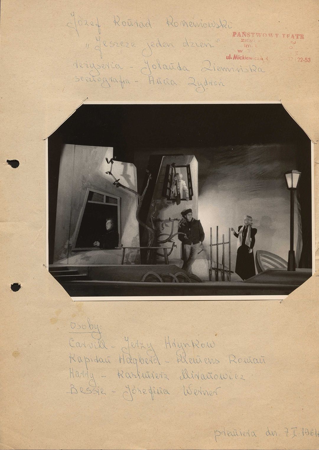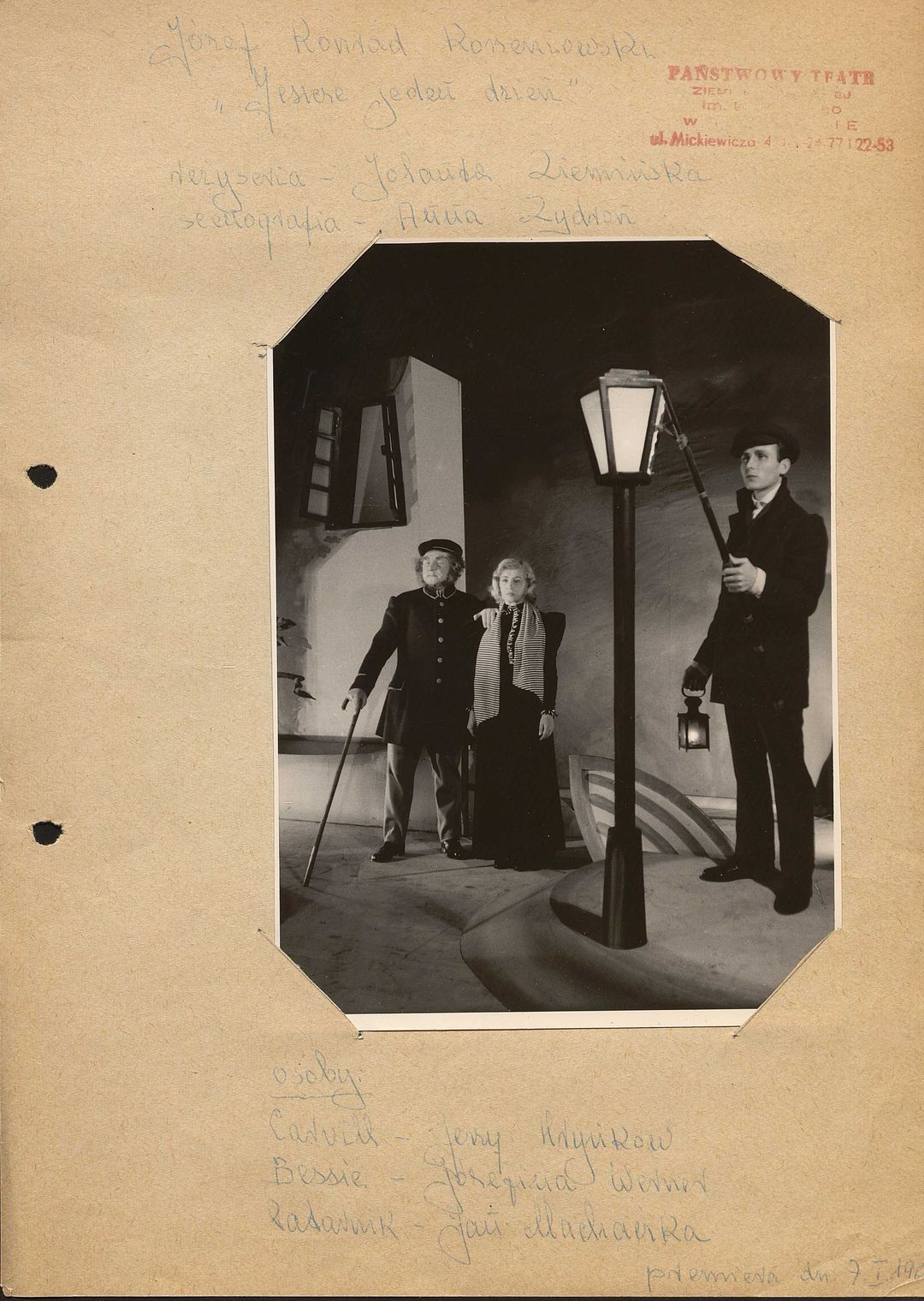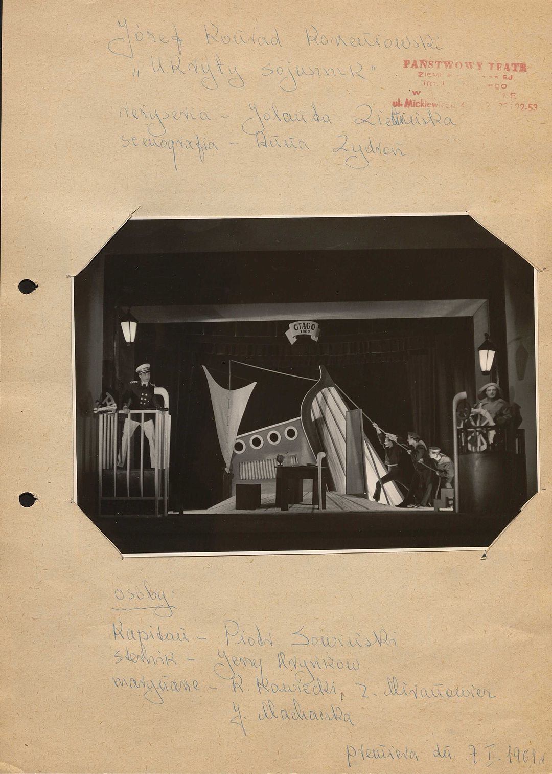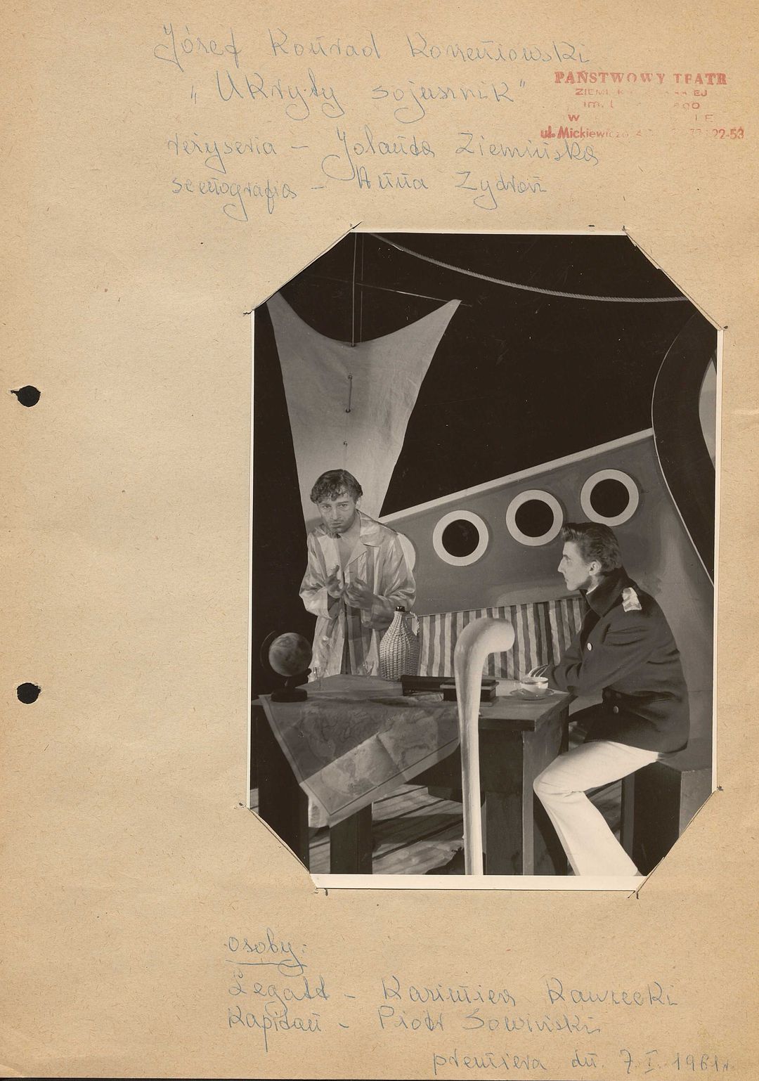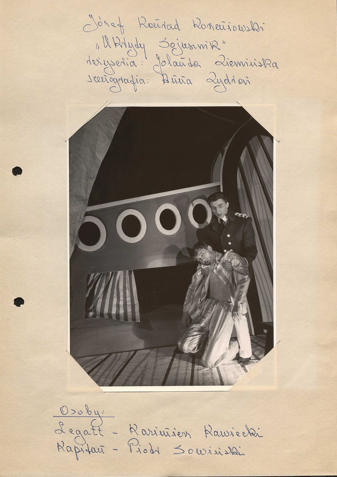 [Zbigniew Kawiecki, Kazimierz Miranowicz, Jan Machaczka jako Marynarze, Piotr Sowiński jako Kapitan, Jerzy Hryńkow jako Sternik w spektaklu "Między lądem a morzem" część I "Ukryty sojusznik" Józefa Conrada Korzeniowskiego]