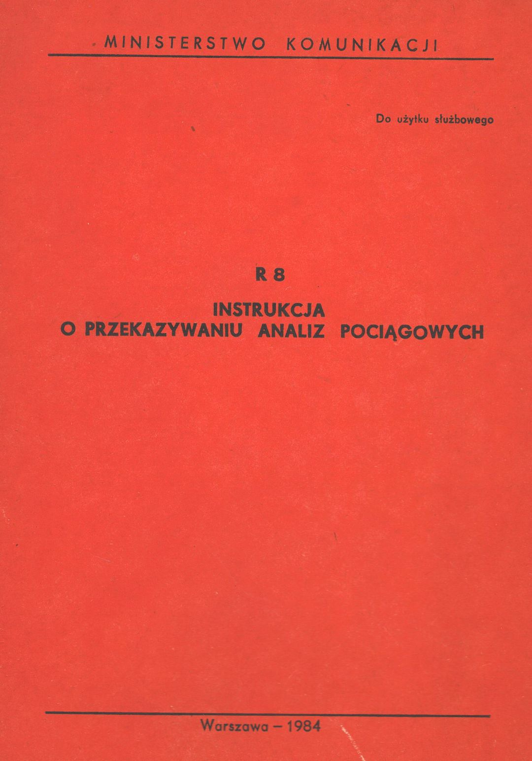 | Inne tytuły: | Instrukcja o przekazywaniu analiz pociągowych R 8 Okólnik Ministerstwa Komunikacji nr CR-4/84 z dnia 1 czerwca 1984 r r. w sprawie ustalenia "Instrukcji o przekazywaniu analiz pociągowych" R 8 |