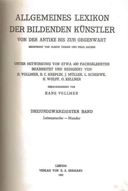 | Redakcja: | Hans Vollmer (1878-1969) Ulrich Thieme (1865-1922) Felix Becker (1864-1928) B. C. Kreplin J. Müller L. Scheewe H. Wolff O. Kellner |
