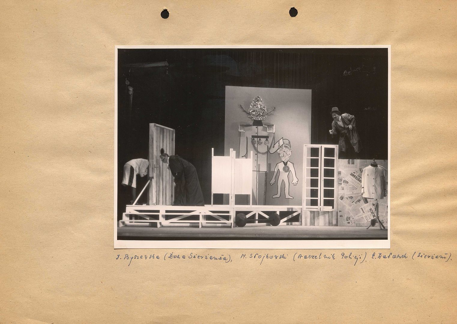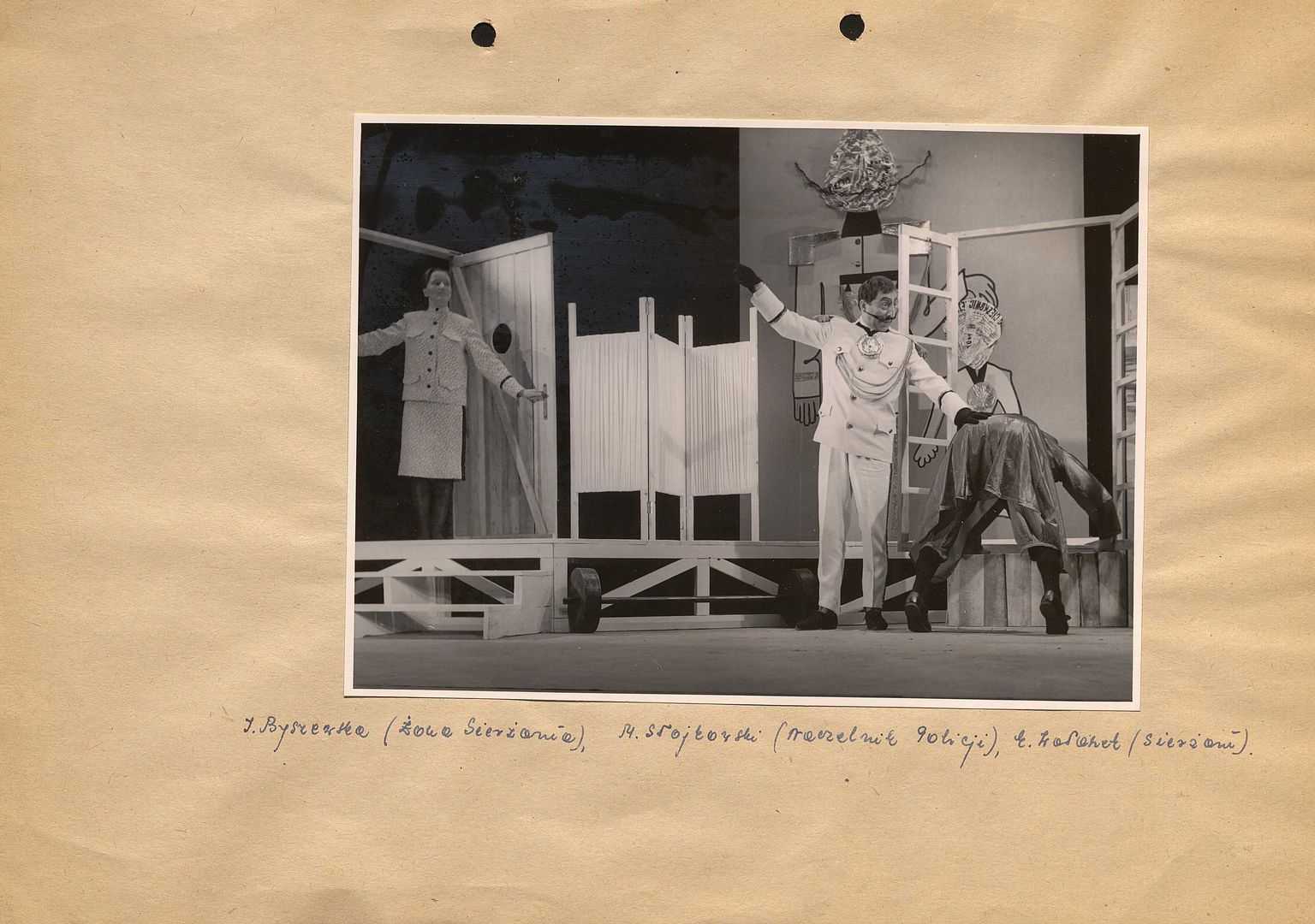 [Irena Byszewska jako Żona Sierżanta, Marian Słojkowski jako Naczelnik Policji, Eugeniusz Wałaszek jako Sierżant w spektaklu "Policja" Sławomira Mrożka]