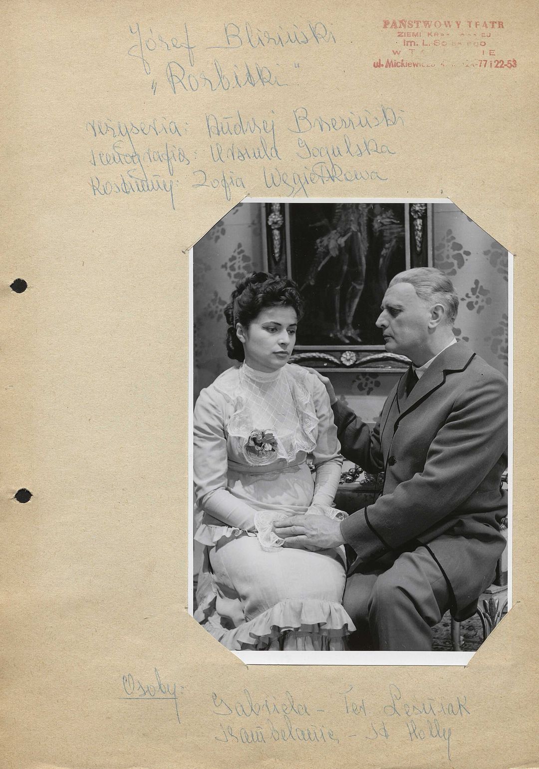 [Teresa Leśniak jako Gabriela i Stanisław Holly jako Szambelanic w spektaklu "Rozbitki" Józefa Blizińskiego]