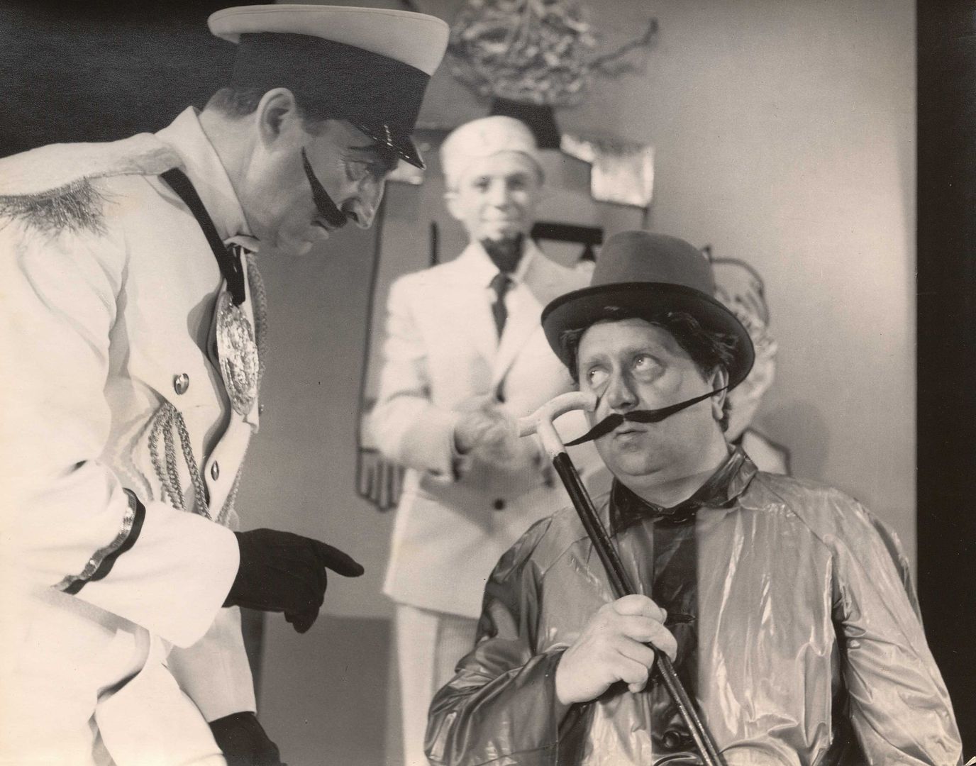 [Marian Słojkowski jako Naczelnik Policji, Eugeniusz Wałaszek jako Sierżant Policji i w głębi Stanislaw Michno jako Więzień w spektaklu "Policja" Sławomira Mrożka]