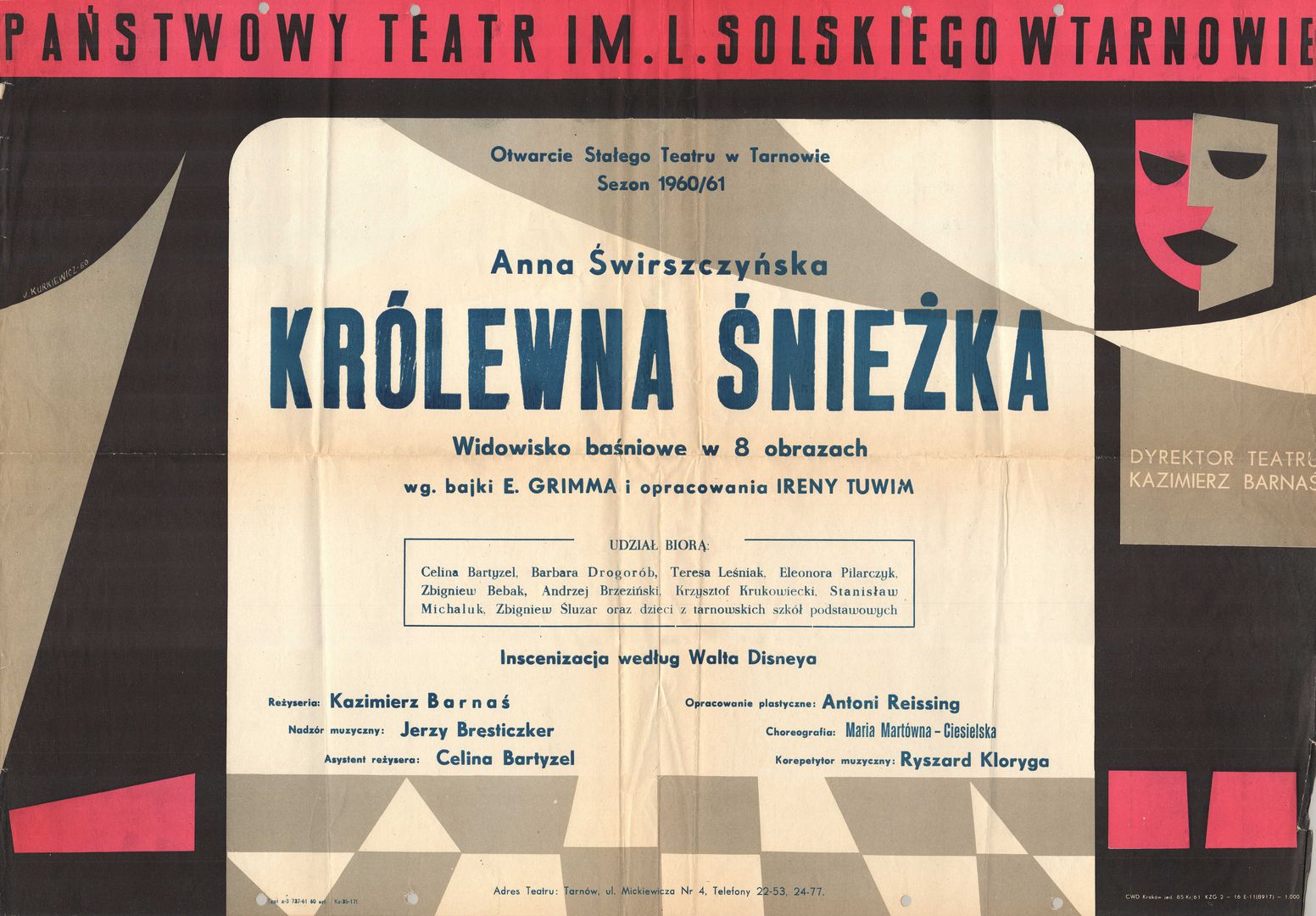 | Inne tytuły: | Otwarcie Stałego Teatru w Tarnowie Sezon 1960/61. Anna Świrszczyńska "Królewna Śnieżka". Widowisko baśniowe w 8 obrazach wg bajki E. Grimma i opracowania Ireny Tuwim. Inscenizacja według Walta Disneya Państwowy Teatr im. Ludwika Solskiego w Tarnowie |