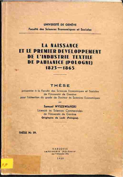La naissance et le premier developpement de l'industrie textile de Pabianice (Pologne) 1823-1865