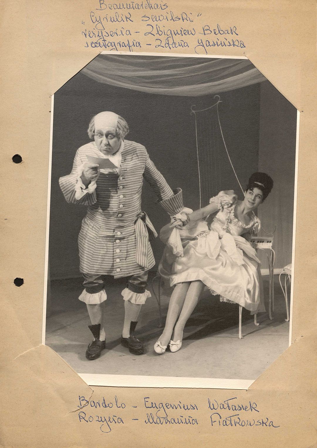 [Eugeniusz Wałaszek jako Bartolo i Marzanna Fiałkowska jako Rozyna w spektaklu "Cyrulik sewilski" Beaumarchais'go]