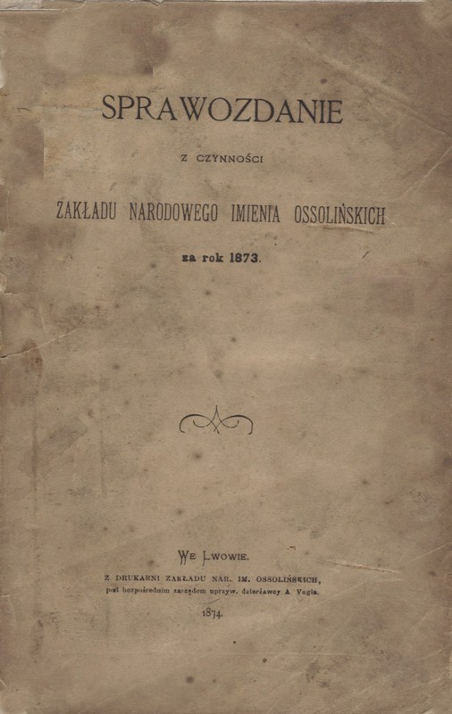 Sprawozdanie z czynności Zakładu Narodowego imienia Ossolińskich za rok 1873