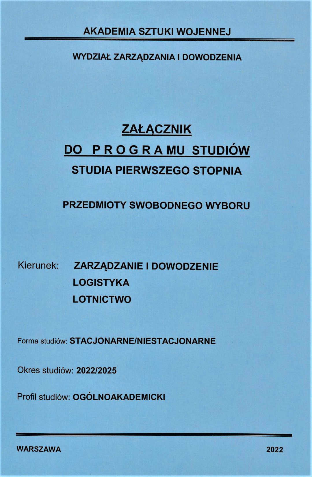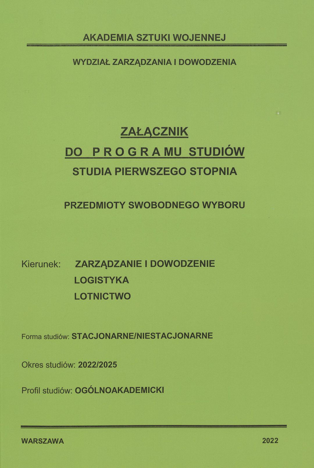 | Inne tytuły: | okres studiów: 2022/2025 forma studiów: stacjonarne/niestacjonarne profil studiów: ogólnoakademicki kierunek: Zarządzanie i Dowodzenie, Logistyka, Lotnictwo studia pierwszego stopnia przedmioty swobodnego wyboru Zarządzanie i Dowodzenie, Logistyka, Lotnictwo |