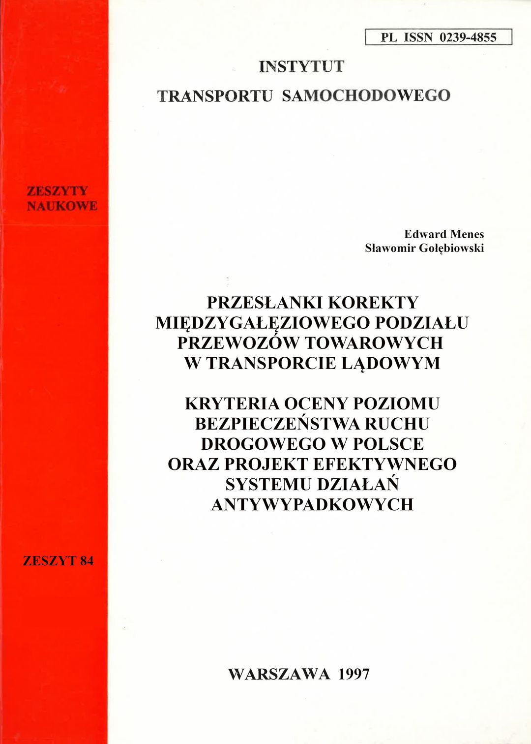 Przesłanki korekty międzygałęziowego podziału przewozów towarowych w transporcie lądowym / Edward Menes. Kryteria oceny poziomu bezpieczeństwa ruchu drogowego w Polsce oraz projekt efektywnego systemu działań antywypadkowych