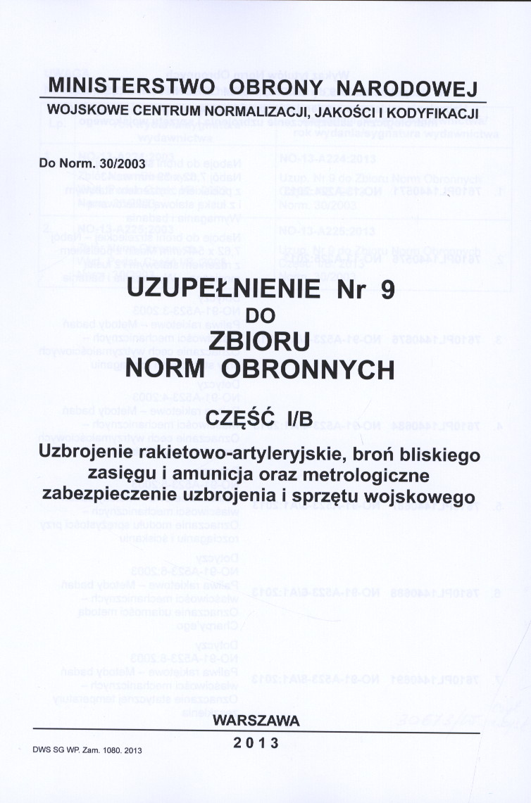 Zbiór norm obronnych: Uzbrojenie rakietowo-artyleryjskie, broń bliskiego zasięgu i amunicja oraz metrologiczne zabezpieczenie uzbrojenia i sprzętu wojskowego