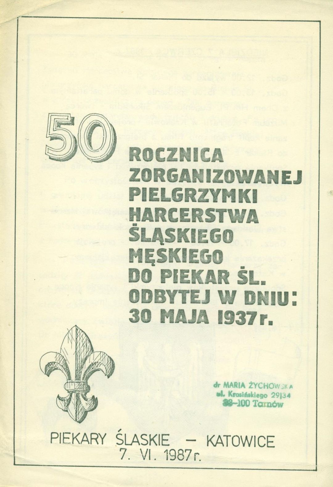 50 rocznica zorganizowanej pielgrzymki harcerstwa śląskiego męskiego do Piekar Śląskich odbytej w dniu: 30 maja 1937 r