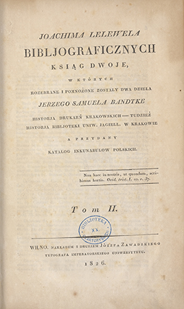 | Inne tytuły: | Joachima Lelewela bibliograficznych ksiąg dwoje, w których rozebrane i pomnożone zostały dwa dzieła Jerzego Samuela Bandtke, Historia drukarń krakowskich - tudzież Historia Biblioteki Uniwersytetu Jagiellońskiego w Krakowie a przydany katalog inkunabułów polskich Bibljograficznych ksiąg dwoje, w których rozebrane i pomnożone zostały dwa dzieła Jerzego Samuela Bandke |