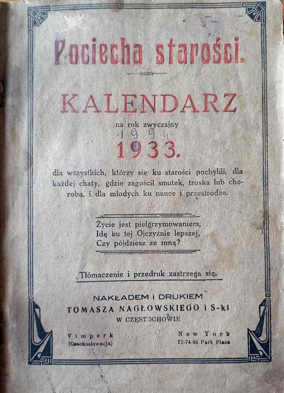 kalendarz na rok zwyczajny 1933 dla wszystkich, którzy się ku starości pochylili, dla każdej chaty, gdzie zagościł smutek, troska lub choroba, i dla młodych ku nauce i przestrodze