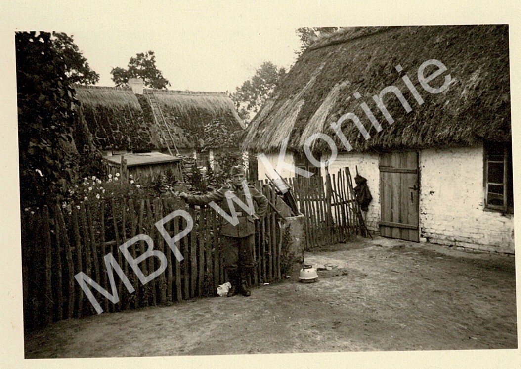 [Żołnierz niemiecki pozujący przy płocie we wsi w okolicach Konina]