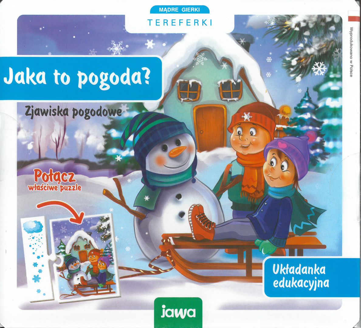 "Co wiemy o pogodzie? Jak wygląda świat wokół nas gdy pada śnieg, a jak gdy świeci słońce? Czy lubimy burzę? Co robimy w deszczowy lub mglisty dzień? Jak się ubieramy w zależności od pogody? Proponujemy zabawę, która przybliży dzieciom pogodowe zjawiska. Układanka zawiera 6 plansz. Każda z nich składa się z 2 części. Gdy plansze zostaną prawidłowo połączone powstaną obrazki przedstawiające różne zjawiska pogodowe. Podczas zabawy dzieci poszerzają swoją wiedzę, rozwijają pamięć, uwagę i spostrzegawczość. Do gry dołączony jest Tygodniowy kalendarz pogody, dzięki któremu dziecko rozwinie umiejętności obserwowania pogody." [Jawa]