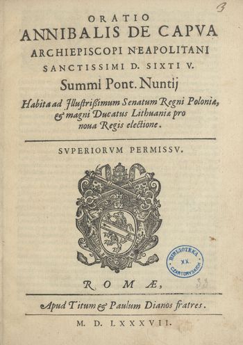 Oratio Annibalis De Capva Archiepiscopi Neapolitani Sanctissimi D. Sixti V. Summni Pont. Nuntij Habita ad Illustrissimum Senatum Regni Poloniae & magni Ducatus Lithuaniae pro nova Regis electione