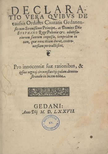 Declaratio Vera Qvibvs De causis Ordines Ciuitatis Gedanensis cum Serenißimo Principe ac Domino [...] Stephano Rege Poloniae &c.n aduersariorum suorum impulsu: