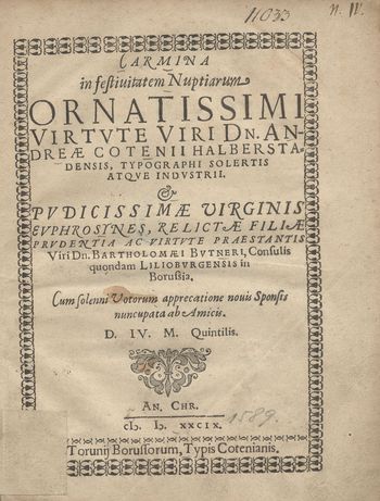 Carmina in festiuitatem Nuptiarum Ornatissimi Virtvte Viri Dn. Andreae Cotenii Halberstadensis, Typographi Solertis Atqve Indvstrii. Pvdicissimae Virginis Evphrosynes, Relictae Filiae Prvdentia Ac Virtvte Praestantis Viri Dn. Bartholomaei Bvtneri, Consulis quondam Liliobvrgensis in Borussia, Cum Solenni Votorum apprecatione nouis Sponsis nuncupata ab Amicis. D.IV.M. Quintilis. An. Chr. 1589