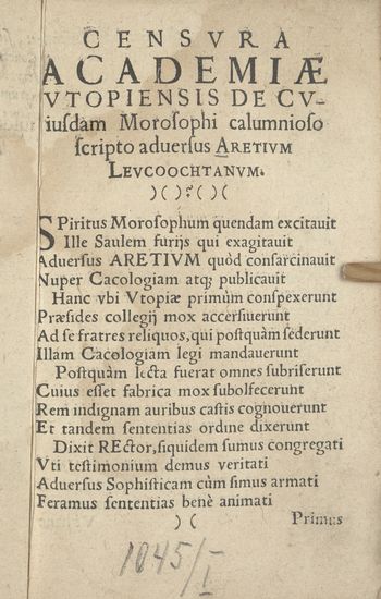 Censvra Academiae Vtopiensis de cviusdam Morosophi calumnioso scripto aduersus Aretivm Levcoochtanvm