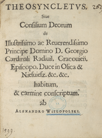 Theosyncletvs siue consilium deorum de illustrissimo ac reuerendissimo... Georgio cardinali Radiuil. Cracouien. Episcopo duce in Olica & Niesuiesz...