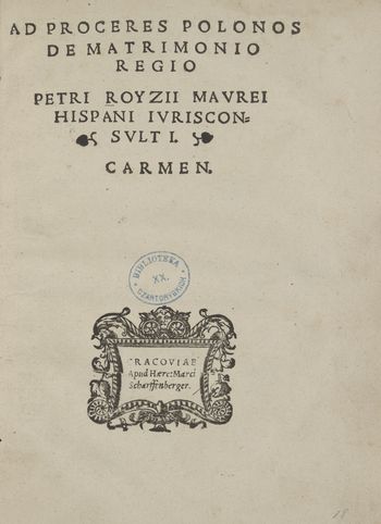 Ad Proceres Polonos De Matrimonio Regio Petrii Royzii Mavrei Hispani Ivrisconsvlti Carmen