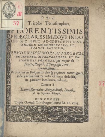 Ode Triclos Tetrastrophos, Florentissimis, Praeclarissimaeqve Indolis Ac Spei Adolescentibvs, Andreae Morenbergero, Et Ioanni Botgero, Prvdentissimorvm Virorvm, Dn. Andreae Morenbergeri, Et Dn. Ioannis Botgeri, pie nuper defuncti, Reipub. Elbigensis Senatorum filijs, Vt feliciter in Poloniam aliasq[ue] regiones commigrent, indes[que] rebus suis ex voto ad finem deductis, in patriam incolumes redeant: Cantata á
