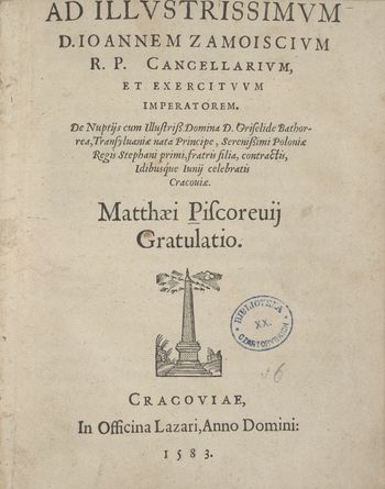 Ad ilvstrissimvm d. Ioannem Zamoiscivm... de nuptijs...cum ... Griselide Bathorrea ...idibusque iunij celebratis Cracouiae... gratulatio