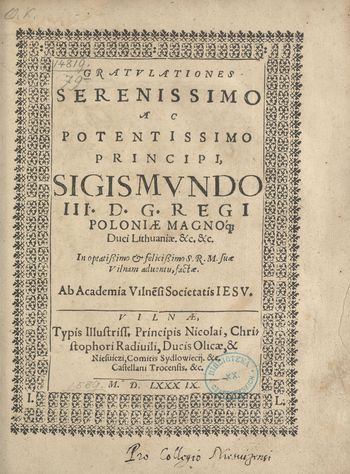 Gratvlationes Serenissimo Ac Potentissimo Principi, Sigismvndo III [...] Regi Poloniae Magnoque Duci Lithuaniae [...] in [...] suae Vilnam aduentu, factae Ab Academia Vilne[n]si Societatis Iesv